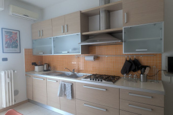 La cucina attrezzata è completa di piano cottura a gas, forno elettrico, forno microonde, frigo, freezer, lavastoviglie, tostapane, bollitore, macchina per caffè espresso, pentole, piatti bicchieri e stoviglie;
