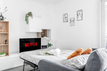 La camera da letto è dotata di un comodo letto matrimoniale (190x160), Smart TV UHD da 43” comprensiva di account Netflix gratuito già registrato, 4 morbidi cuscini in memory foam, un ampio armadio completo di grucce appendiabiti ed una cassettiera.