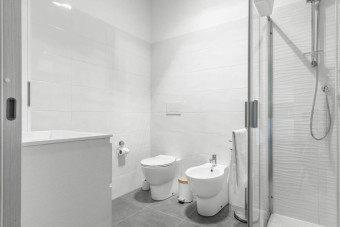 Il bagno, decorato con finiture di pregio è dotato di una doccia spaziosa, uno specchio, un lavandino e un mobiletto dove riporre comodamente il proprio beauty.