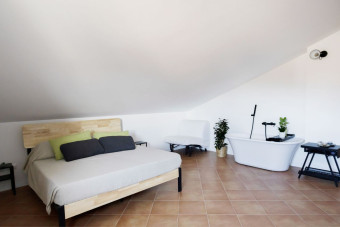 Attraverso delle scale a chiocciola si arriva al piano superiore mansardato dove si trova una camera matrimoniale con letto Queen-Size e vasca freestanding. A disposizione anche una poltrona letto singola e una culla per avere i bambini accanto durante la notte.