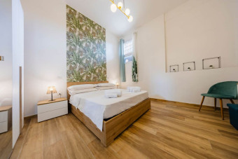 Camera spaziosa con letto matrimoniale e arredi eleganti;